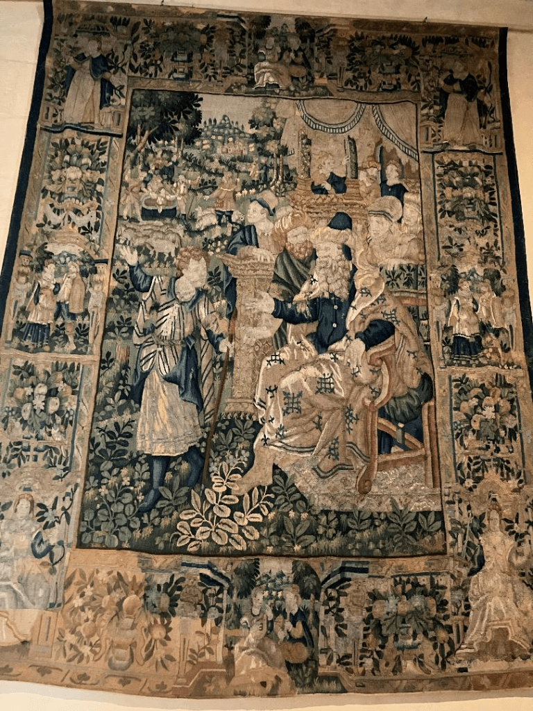 There are many unique and beautiful tapestries at the castle. Tapestry design falls into 3 categories – religious, mythical, and those with a military/war type design. Tapestries act as an insulator removing the cold from the castle., When royalty moved from castle to castle they brought their tapestries, dishes, and furniture with them to their next abode.