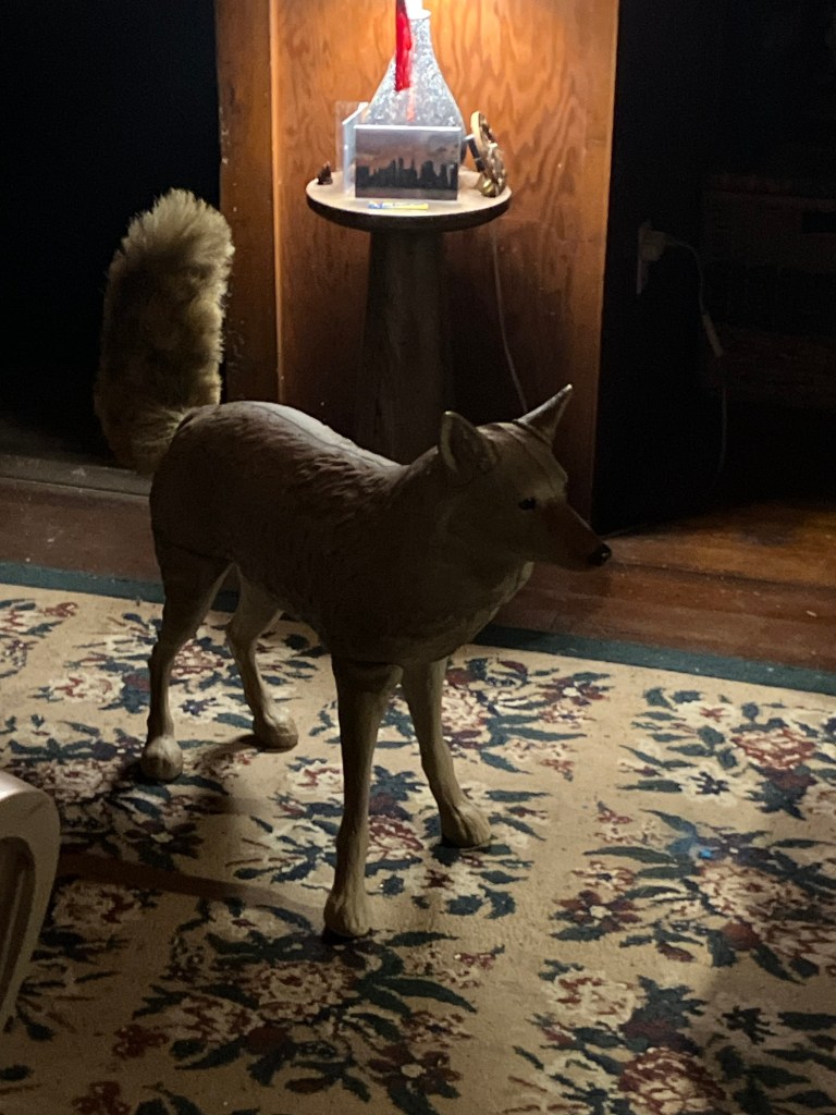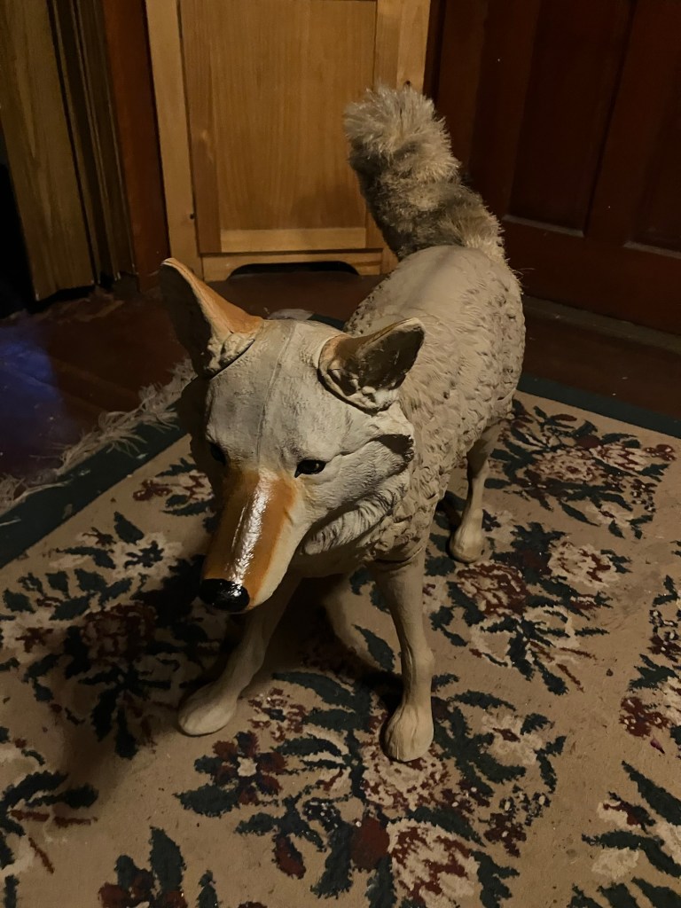 There is a new man 👨 in my life, Steve, the Coyote. He was purchased from Amazon for $87. to keep the deer from eating my newly planted Arborvitae🌲 and ornamental grasses.