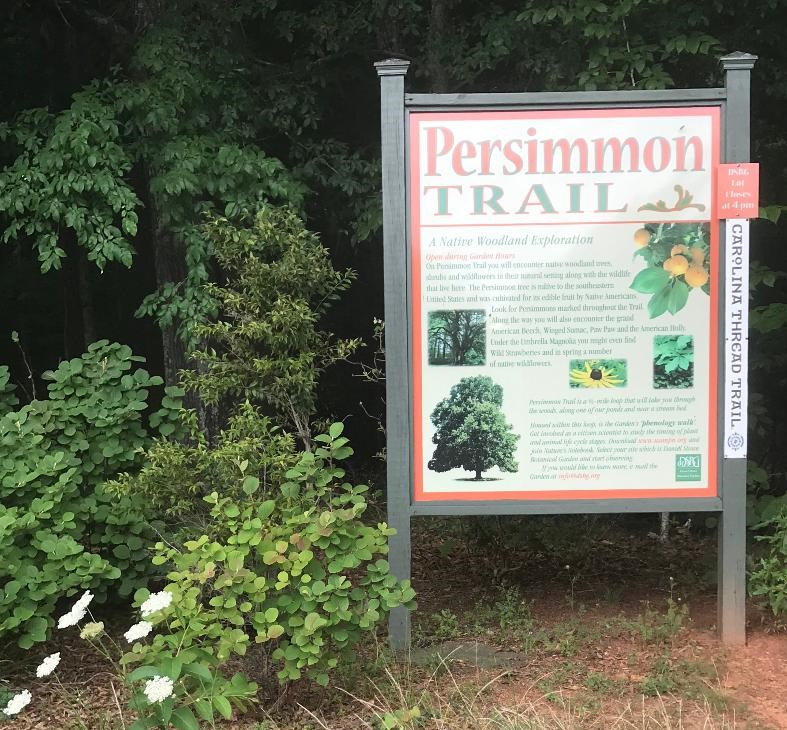 On the grounds of the Daniel Stowe Botanical Garden is the Persimmon Trail. Seek this out as it is a lovely, easy to walk trail, and a perfect end to your visit. On the trail you will find folks walking, jogging, riding their bikes, and lovers holding hands. It is also attached to the Carolina Thread Trail which is a 300 mile long network of greenery, blueways, and trails in 15 counties, 2 states, reaching 2.9 million people according to Auntie Google. .