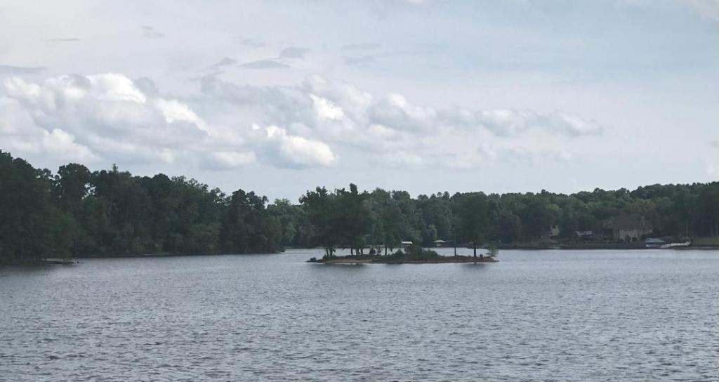 There is a walkway over the water to an island which has a playground for children, and trails.